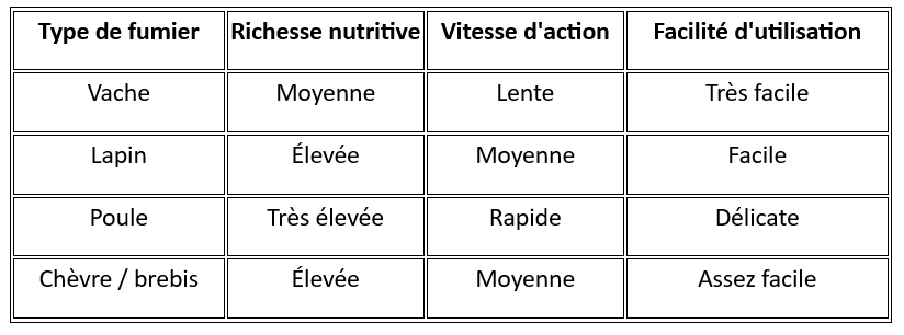 Chaque fumier possède ses qualités. Le fumier de vache nourrit surtout le sol sur le long terme, celui de lapin est pratique et riche, celui de poule agit rapidement mais demande de la prudence, tandis que les fumiers de chèvre ou de brebis offrent un bon équilibre.